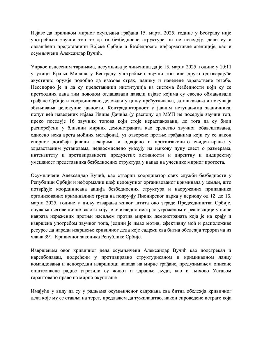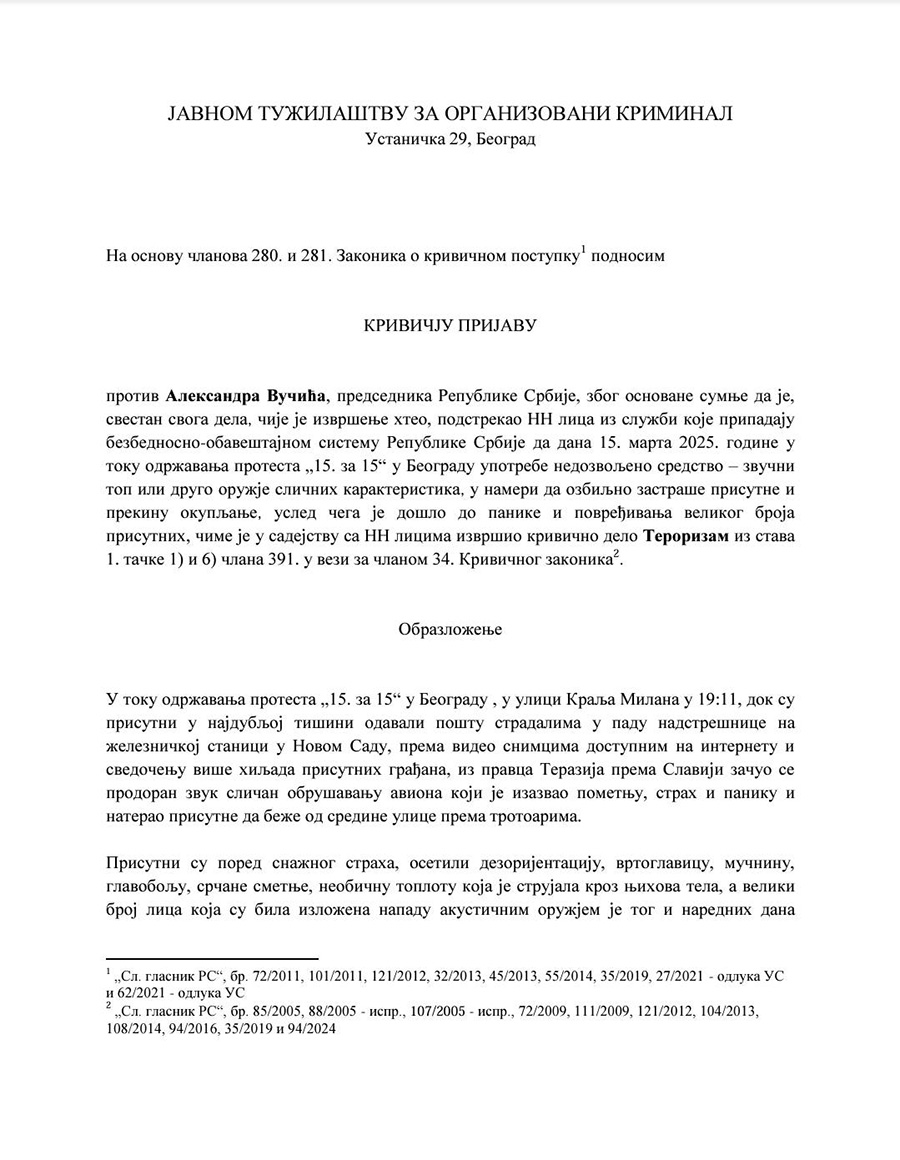 Kako se navodi u krivičnoj prijavi, zbog osnovane sumnje da je, svestan svoga dela, čije je izvršenje hteo, podstrekao NN lica iz službi koje pripadaju bezbednosno-obaveštajnom sistemu Republike Srbije da dana 15. marta 2025. godine u toku održavanja protesta “15. za 15” u Beogradu upotrebe nedozvoljeno sredstvo – zvučni top ili drugo oružje sličnih karakteristika, u nameri da ozbiljno zastraše prisutne i prekinu okupljanje, usled čega je došlo do panike i povređivanja velikog broja prisutnih, čime je u sadejstvu sa NN licima izvršio krivično delo Terorizam iz stava 1. tačke 1) i 6) člana 391. u vezi za članom 34. Krivičnog zakonika.