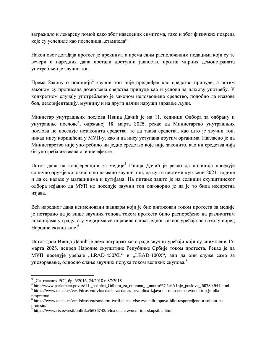 Dobrašinović je Tužilaštvu za organizovani kriminal uputio krivičnu prijavu protiv Aleksandra Vučića zbog krivičnog dela terorizma, koje je izvršio podstrekavanjem i izdavanjem naređenja NN licima za upotrebu zvučnog topa 15. marta 2025. godine u ulici Kralja Milana u Beogradu.