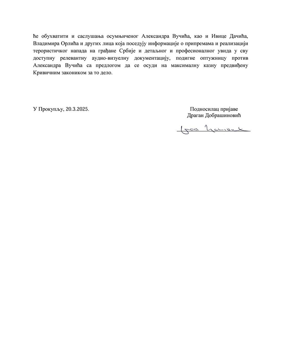 Dobrašinović u svojoj prijavi predlaže da tužilaštvo, nakon sprovedene istrage koja će obuhvatiti i saslušanja osumnjičenog Aleksandra Vučića, kao i Ivice Dačića, Vladimira Orlića i drugih lica koja poseduju informacije o pripremama i realizaciji terorističkog napada na građane Srbije i detaljnog i profesionalnog uvida u svu dostupnu relevantnu audio-vizuelnu dokumentaciju, podigne optužnicu protiv Aleksandra Vučića sa predlogom da se osudi na maksimalnu kaznu predviđenu Krivičnim zakonikom za to delo.