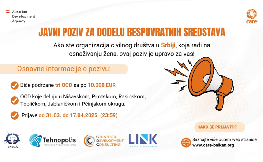 CARE Balkans, u partnerstvu sa ENECA, LINK, Strategic Development Consulting i Tehnopolis, objavljuje javni poziv za dodelu grantova organizacijama civilnog društva koje se bave osnaživanjem žena u Nišavskom, Pirotskom, Rasinskom, Topličkom, Jablaničkom i Pčinjskom okrugu. Ovaj poziv se realizuje u okviru projekta „Ekonomska inkluzija i pravda za žene Zapadnog Balkana“ (EWI), koji finansira Austrijska razvojna agencija (ADA).
