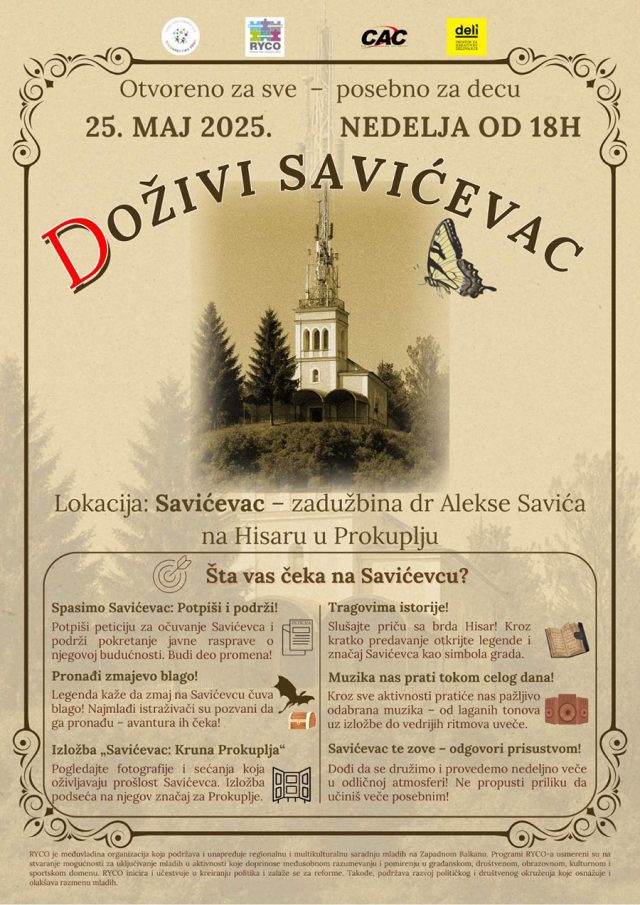 Neformalna grupa građana poziva sve Prokupčane da u nedelju, 25. maja od 18 časova, dođu na Hisar i podrže inicijativu „(D)oživi Savićevac“, čiji je cilj oživljavanje i očuvanje ovog nekada omiljenog kutka Prokuplja.