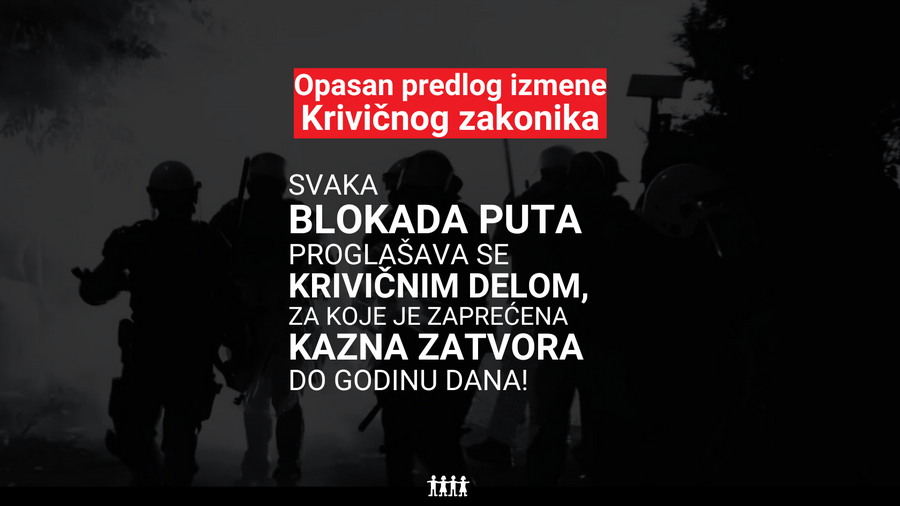 Nacrt izmena i dopuna Krivičnog zakonika, o kojem javna rasprava traje do 1. oktobra, predviđa i izmenu člana 290. Do sada je ovaj član predviđao krivičnu odgovornost ukoliko se “postavljanjem prepreka na saobraćajnicama, zaustavljanjem prevoznog sredstva u železničkom saobraćaju protivno propisima ugrozi javni saobraćaj” tako da “dovede u opasnost život ili telo ljudi ili imovinu većeg obima”. Predloženim izmenama briše se taj uslov i uvodi kazna zatvora do godinu dana za svakoga ko “postavlja prepreke na saobraćajnicama i zaustavlja prevozna sredstva u saobraćaju protivno propisima”. To znači da će svaka protestna blokada bilo koje ulice moći da se tretira kao krivično delo – čak i kada ne postoji nikakva stvarna opasnost.