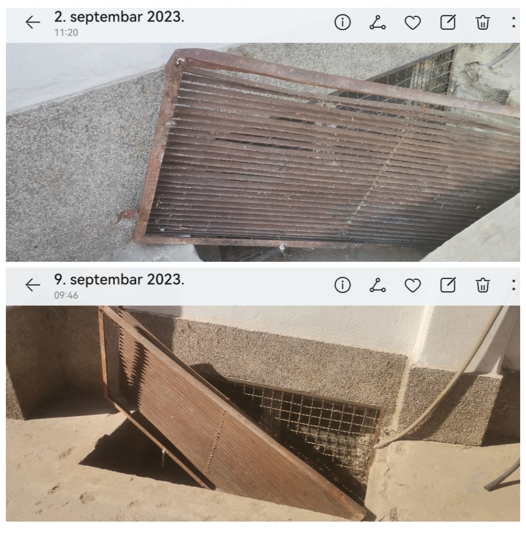2. septembra zabeležili smo ovu rešetku ispred penzionerske zgrade. Nismo reagovali jer smo smatrali da je to lako rešivo i da će se u roku od par sati neko potruditi da ovu rešetku vrati na svoje mesto.