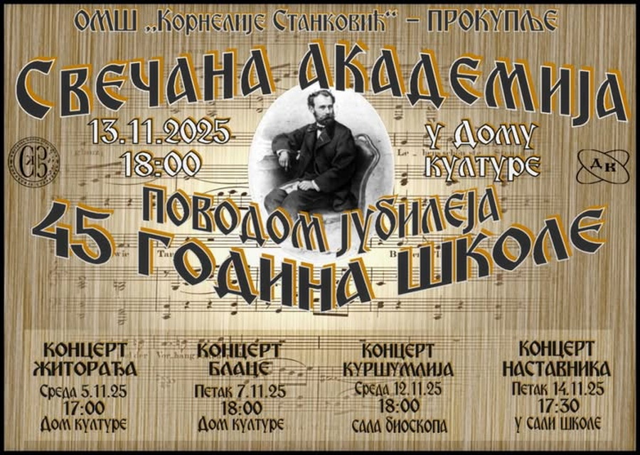 Centralni događaj proslave biće svečana akademija povodom jubileja, koja će se održati 13. novembra u Domu kulture u Prokuplju, sa početkom u 18 časova.