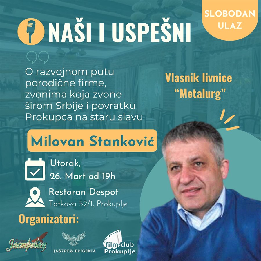 U okviru serijala NAŠI I USPEŠNI, u organizaciji  UG Volimo Jastrebac, koji su do sada predstavili više naših uspešnih i ostvarenih ljudi, koji su ostavili nešto svom narodu, u utorak 26. marta, u restoranu Despot, sa početkom od 19 časova, imaćemo još jedno poznato lice.