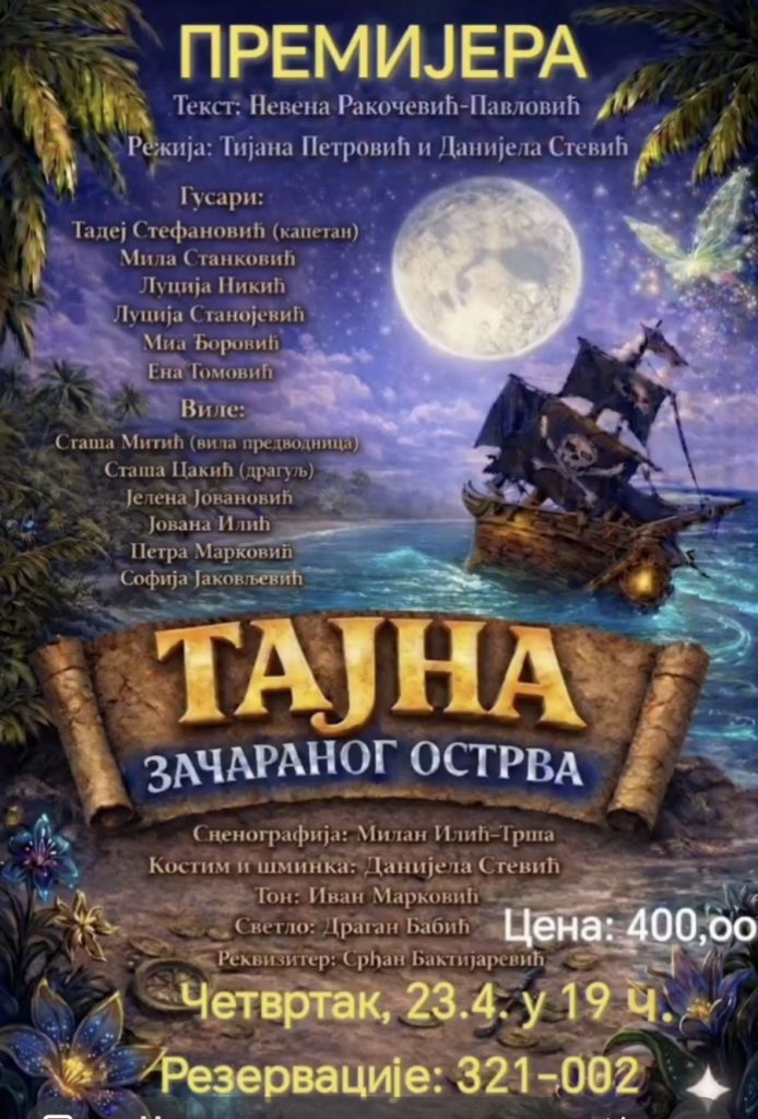 U četvrtak, 23. aprila, u Domu kulture u Prokuplju biće premijerno izvedena dečja predstava “Tajna začaranog ostrva”, sa početkom u 19 časova.