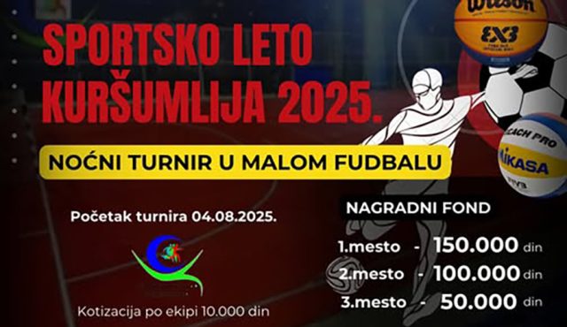 Sportski centar Kuršumlija poziva sve zainteresovane ekipe da se prijave za noćni turnir u malom fudbalu, koji će biti održan početkom avgusta. Prijave su otvorene do petka, 1. avgusta 2025. godine u 10 časova, dok je izvlačenje parova zakazano za isti dan u 12 časova, u prostorijama Sportskog centra.