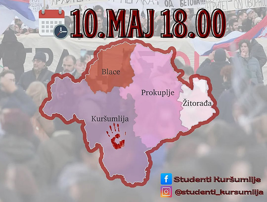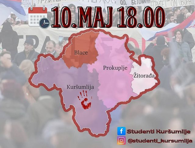 Studenti iz Kuršumlije najavili su veliki protest koji će se održati u subotu, 10. maja, s početkom u 18 časova, u gradskom parku u centru Kuršumlije.