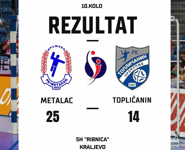 U okviru 10. kola rukometne Super B lige rukometaši Topličanina su doživeli ubedljiv poraz u Kraljevu od ekipe Metalca rezultatom 25:14 (11:8).