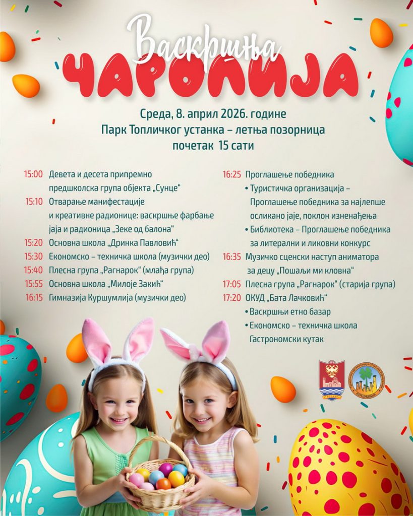 Opština Kuršumlija i Turistička organizacija Kuršumlija pozvali su građane da se pridruže manifestaciji “Vaskršnja čarolija”, koja će biti održana u sredu, 8. aprila, u parku Toplički ustanak, na letnjoj pozornici, sa početkom u 15 časova.