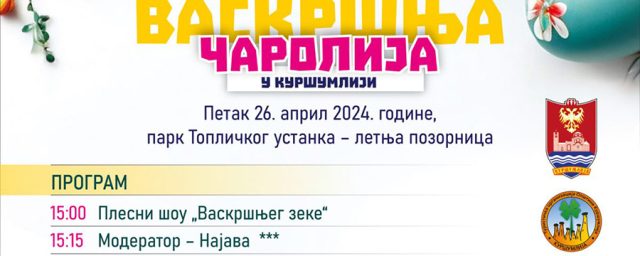 U organizaciji Opštine Kuršumlija i Turističke organizacije, u petak 26. aprila od 15 časova, u gradskom parku održaće se porodična manifestacija “Vaskršnja čarolija 2024”.