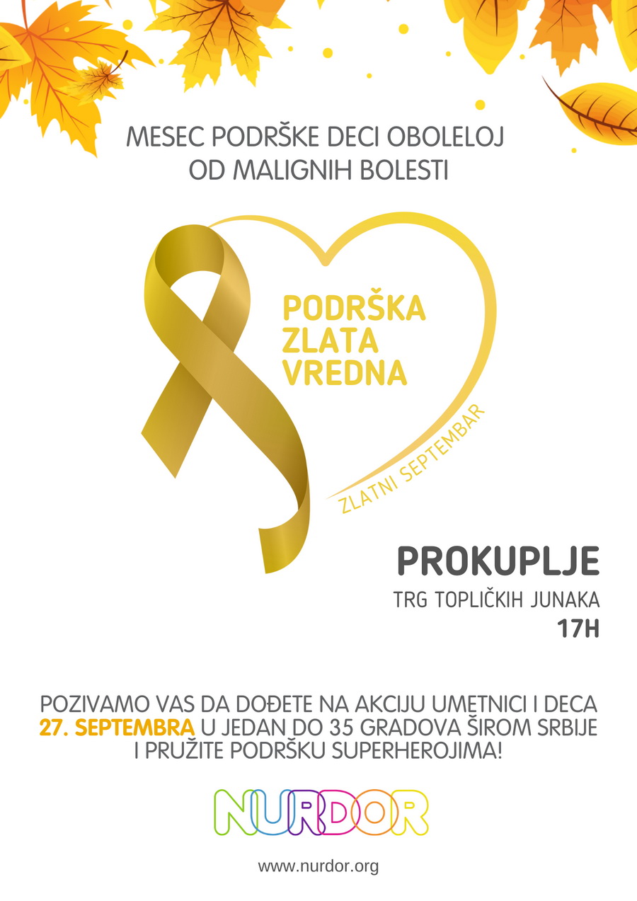 NURDOR obeležava Zlatni septembar – mesec podrške deci oboleloj od malignih bolesti, tako što će 27. septembra sa početkom u 16h organizovati program za decu i kreativne radionice u 35 gradova širom Srbije.